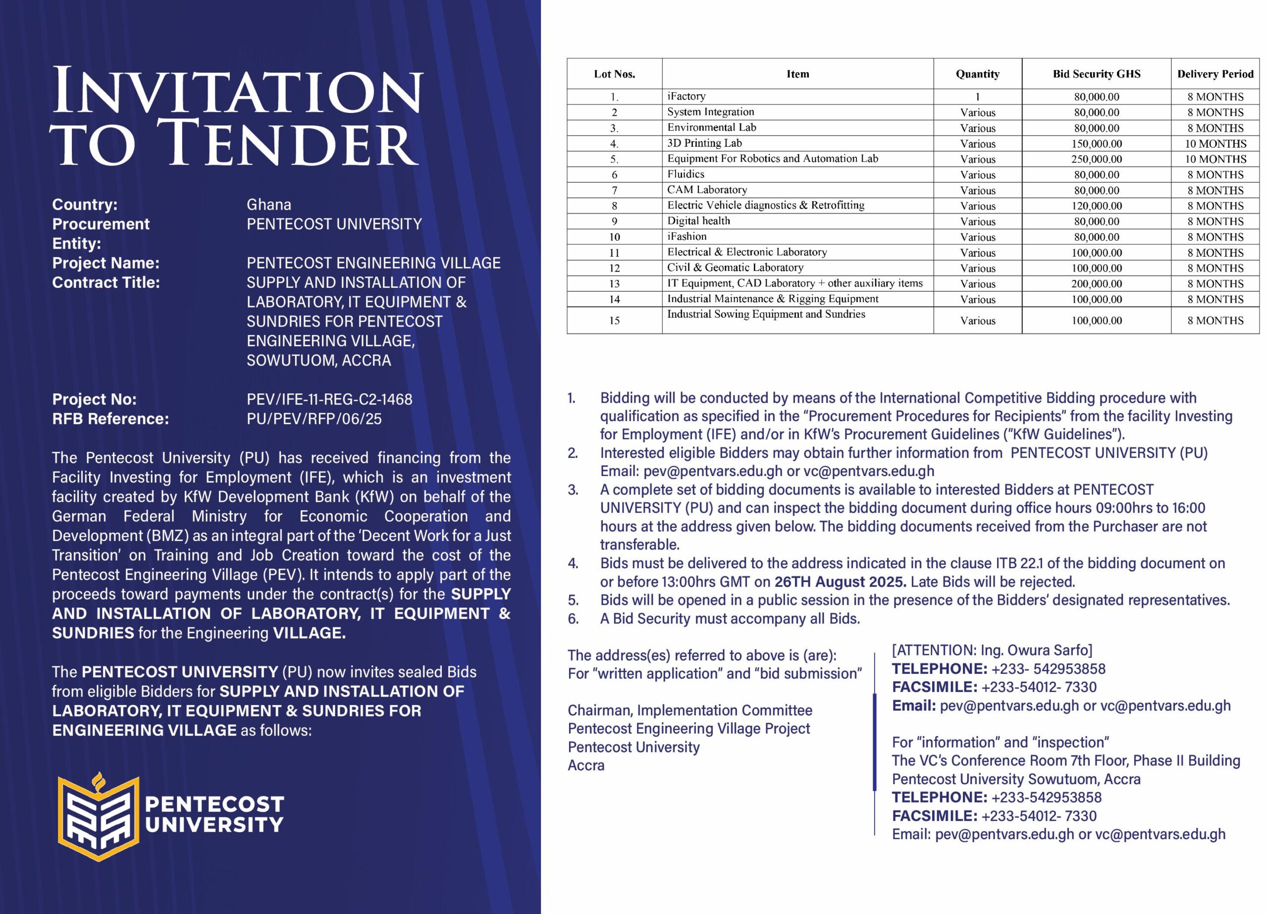 Pentecost University has officially launched an international call for sealed bids for the supply and installation of laboratory, IT equipment, and sundries to support the development of its Pentecost Engineering Village (PEV). This initiative forms part of a broader strategy …