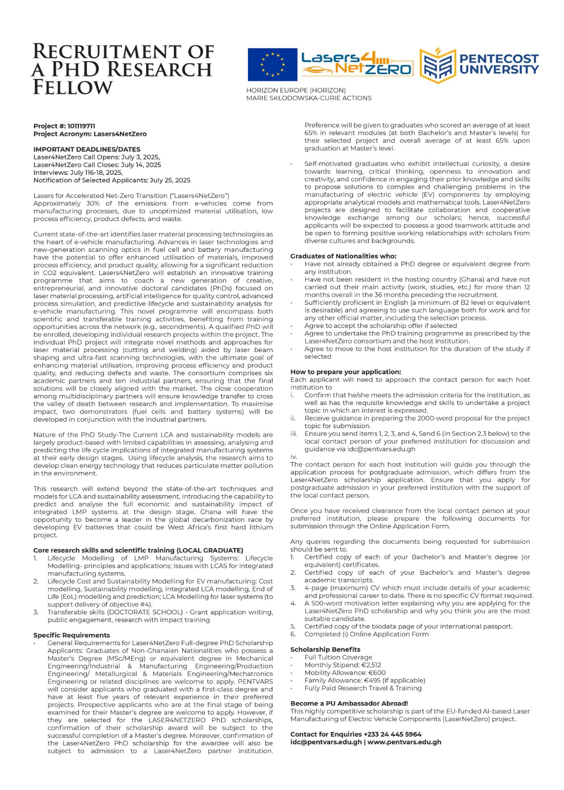 Pentecost University, in collaboration with the EU-funded Laser4NetZero project under the Horizon Europe Marie Skłodowska-Curie Actions, is offering a unique opportunity for ambitious graduates to pursue a fully funded PhD in cutting-edge sustainable manufacturing technologies. The Laser4NetZero programme is focused …